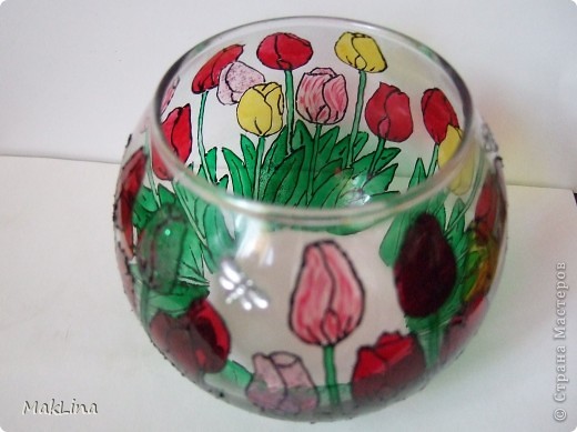 Это наши с сынулей поделки, решила вам показать. Даньке очень понравилось на стекле рисовать. Одну вазочку мы даже учительнице подарили, ей понравилось.